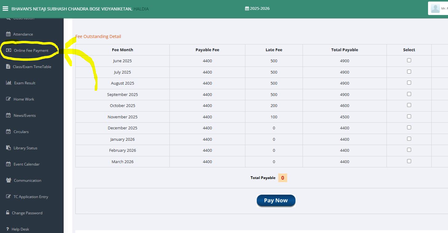 Select the installment from fee outstanding detail , after that click on the 'Pay Now' button.